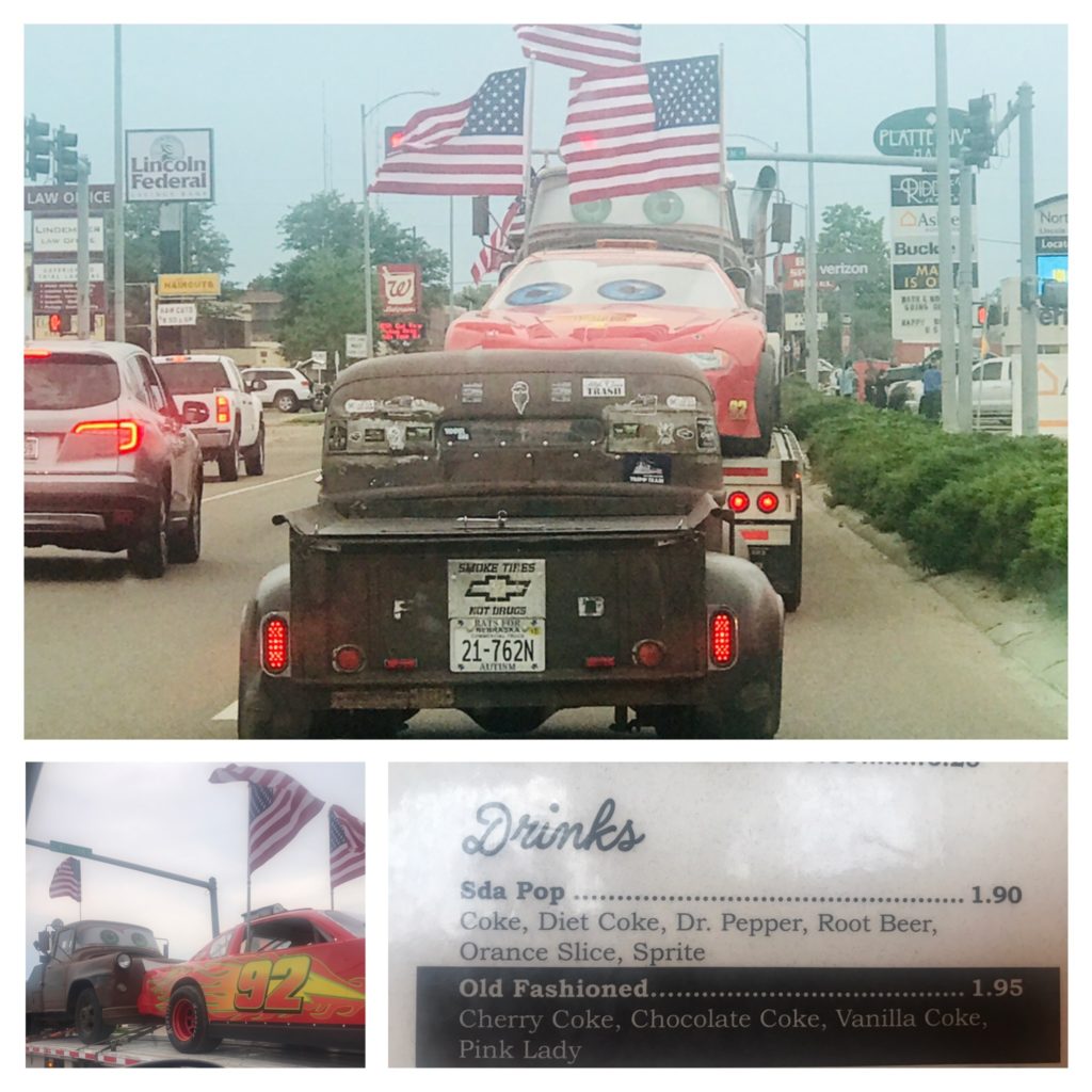So anyway, our destination today was North Platte. We pulled into town during a lull in a pretty harrowing storm. Lightning McQueen and Mater are taking a ride down the road. Wait, what? What’s going on here in this storm?