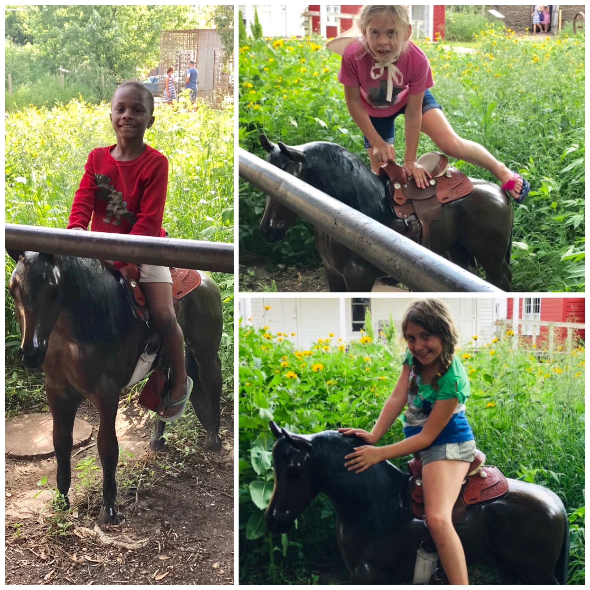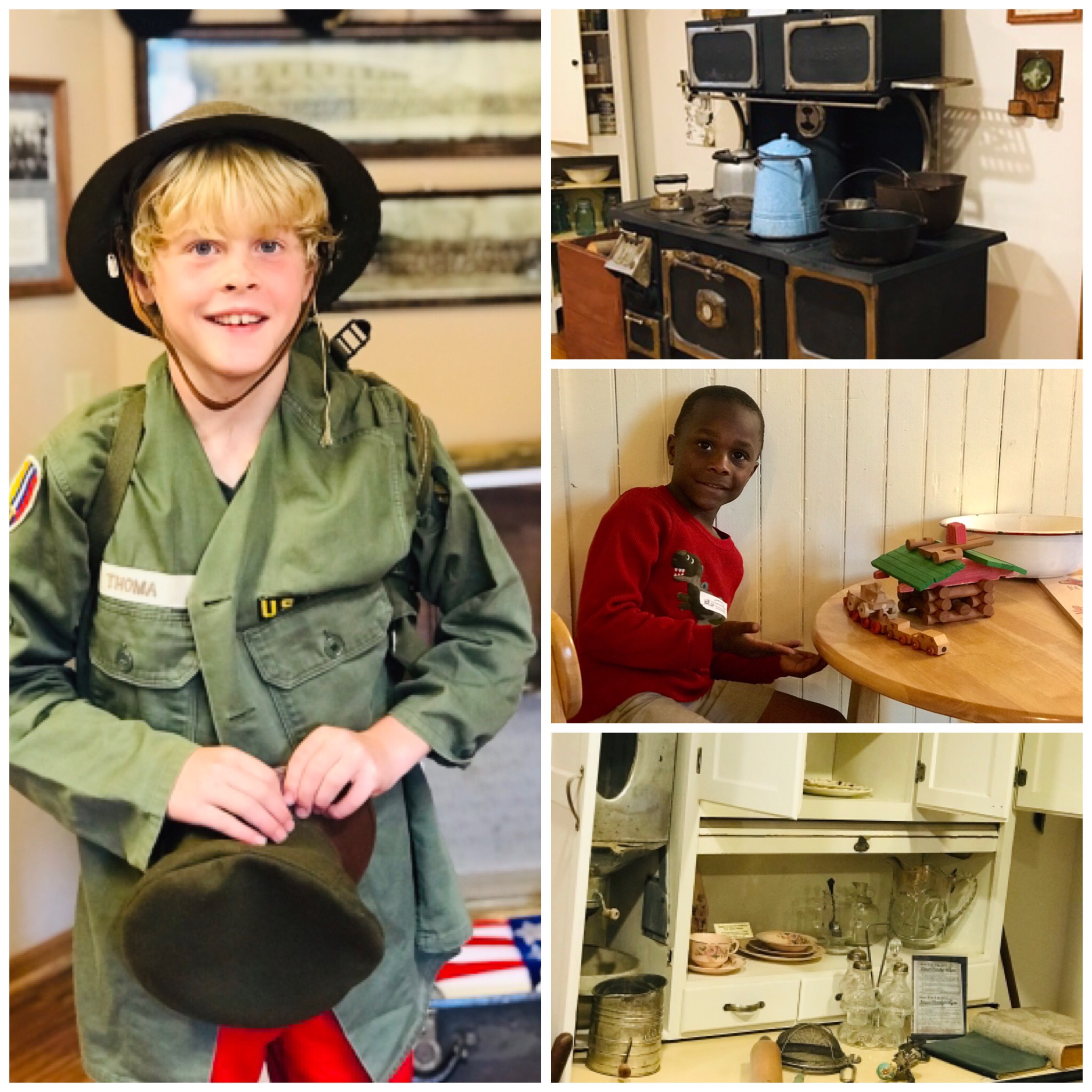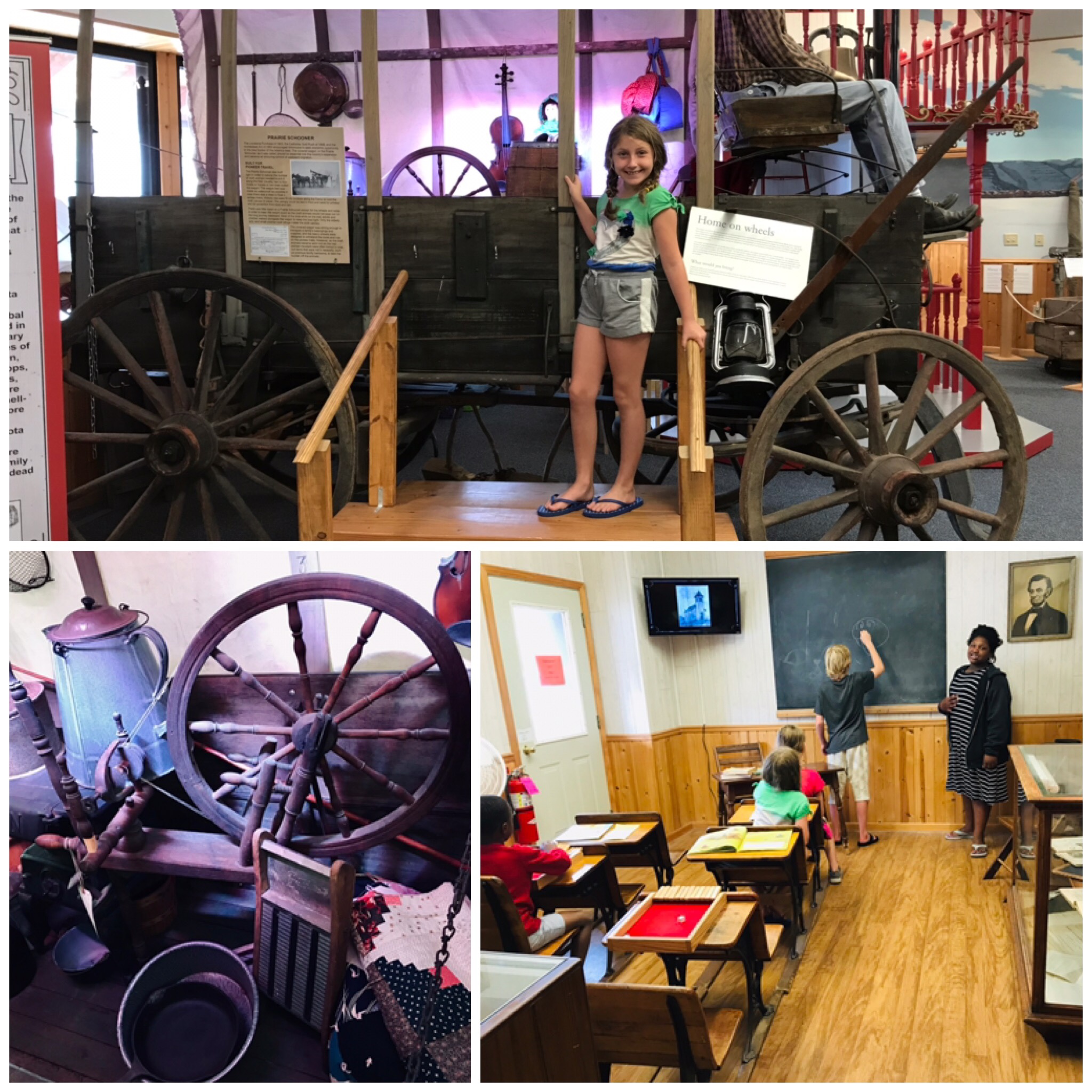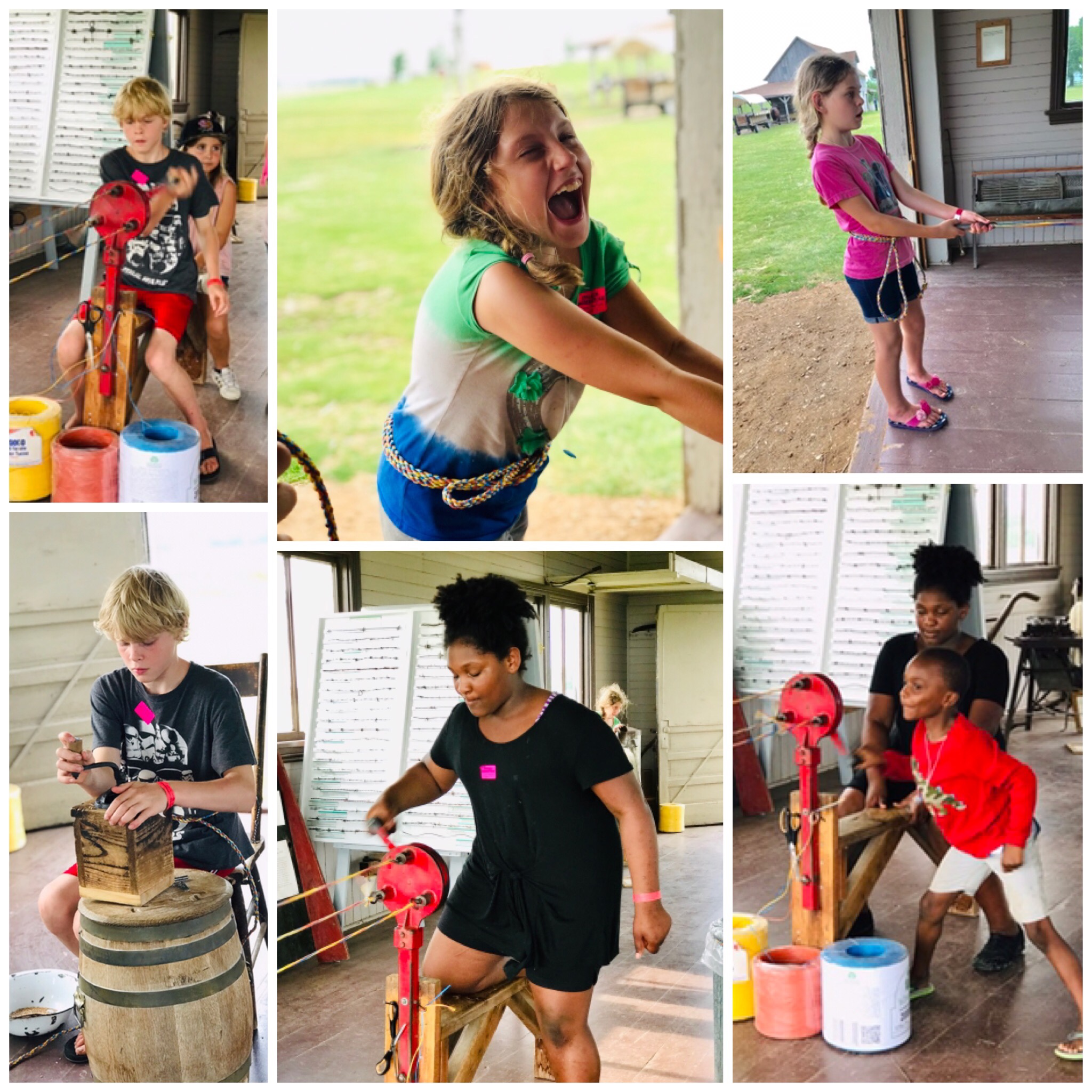 And, of course, the Little House TV show house replica. Here, the kids learned how to make braid rugs, how to do laundry on the prairie, and how to make pioneer “fidget spinners.” These were a button on a looped string that can be spun like a yo-yo. It took a few tries, but the kids soon found that they could master this fun game. It took far more skill than a fidget spinner!