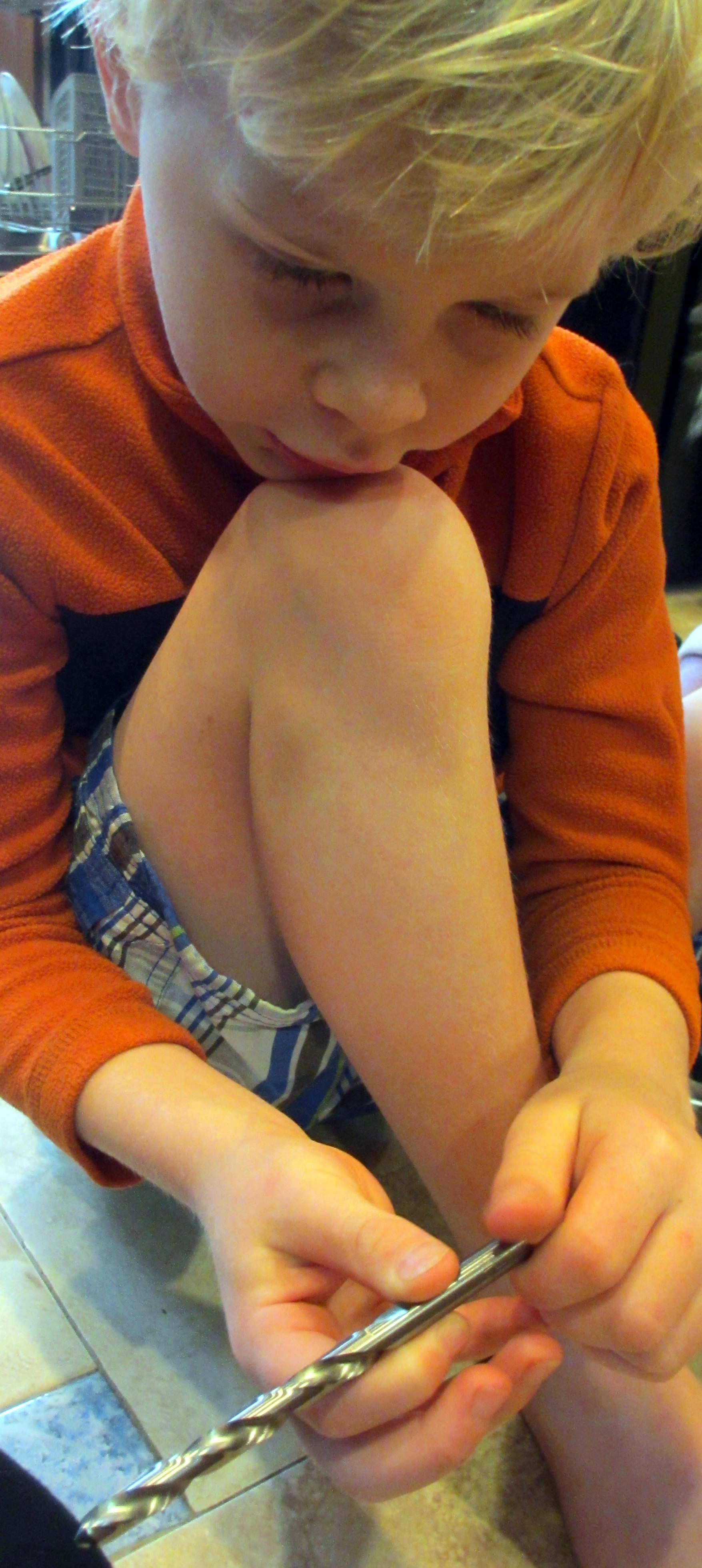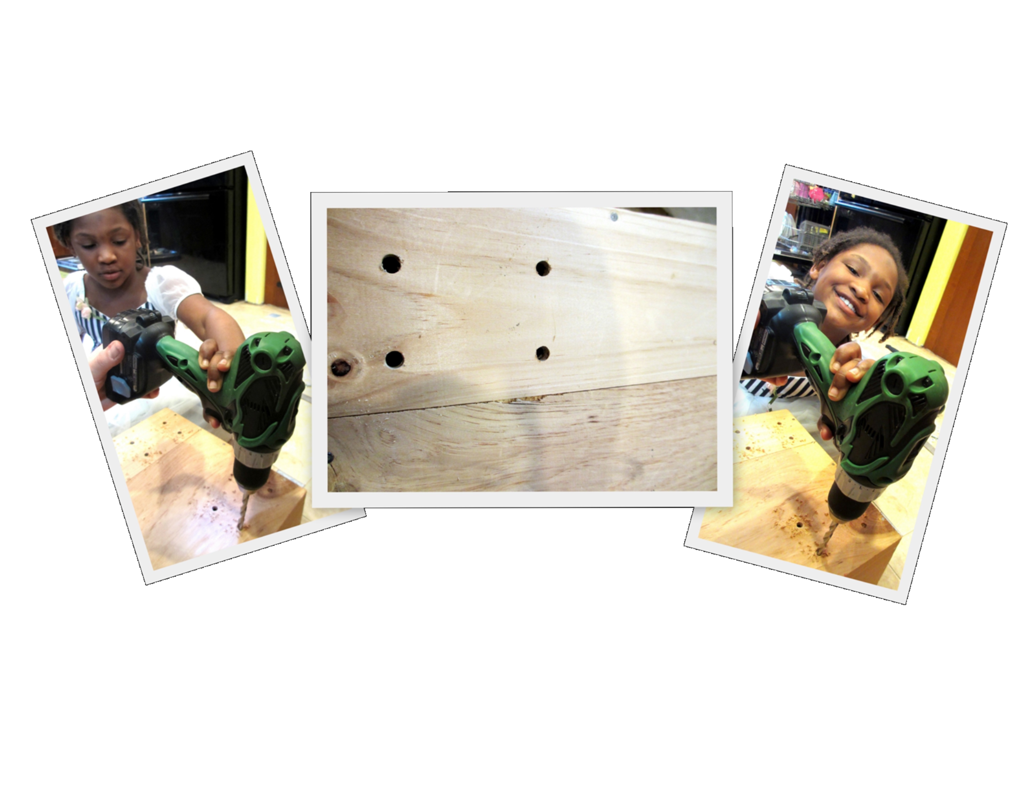 Next, we drilled. Begin at a slow speed so that you dig a divot with the drill before you increase your drill speed, or your drill may drift, resulting in an off-center bolt hole. The kids each pulled the drill trigger for a few holes and were able to figure out the drill speed, mastering the slow-to-fast method. I held the drill straight and stable for them. 🙂