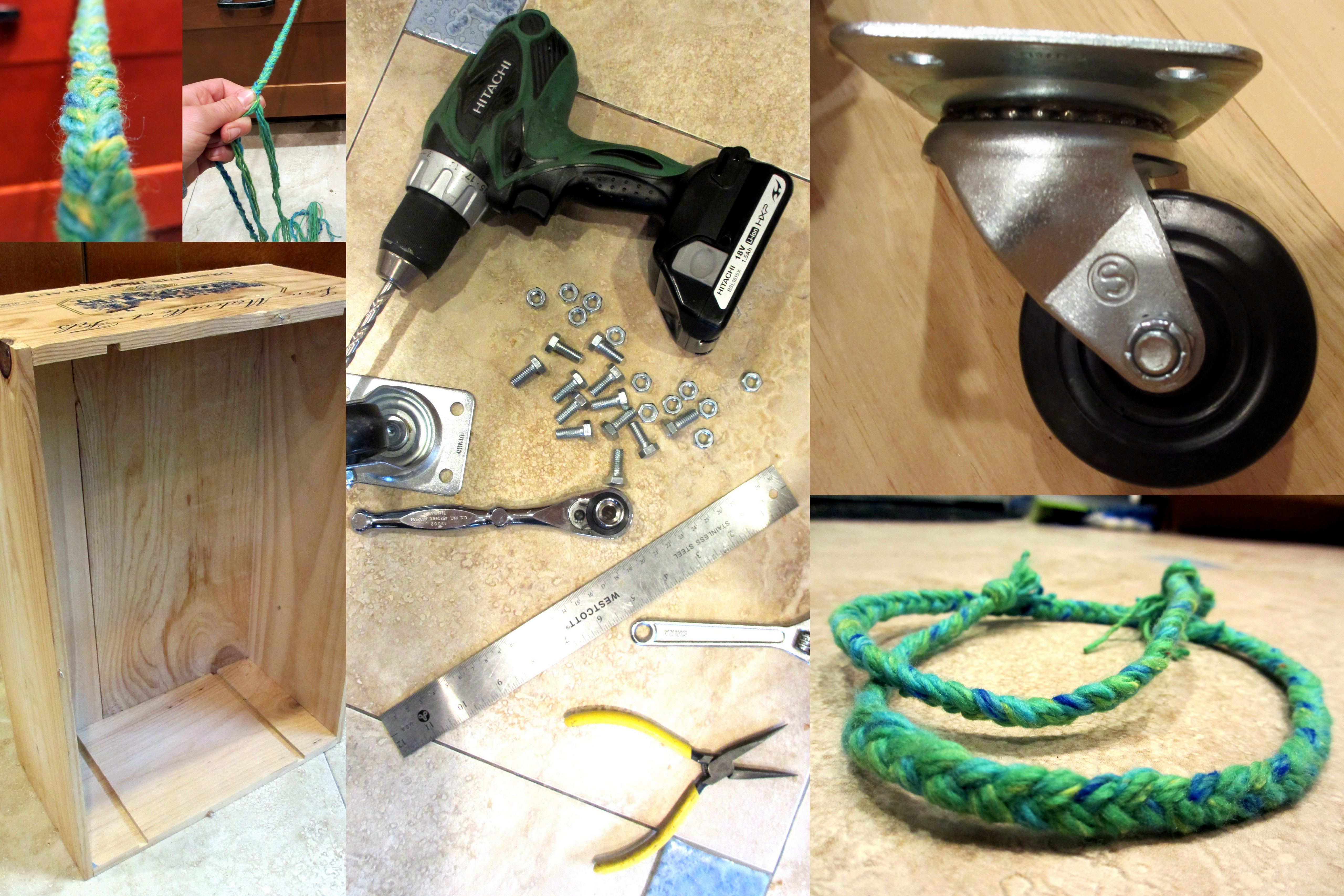 12. About a yard of soft, medium-gauge rope that will string through one of the washers. If you want something more exciting, you can braid about 15 strands of multi-colored yarn to length. You can skip the rope if you are concerned about strangulation. You will have a REALLY fun crate on wheels rather than a wagon. 🙂