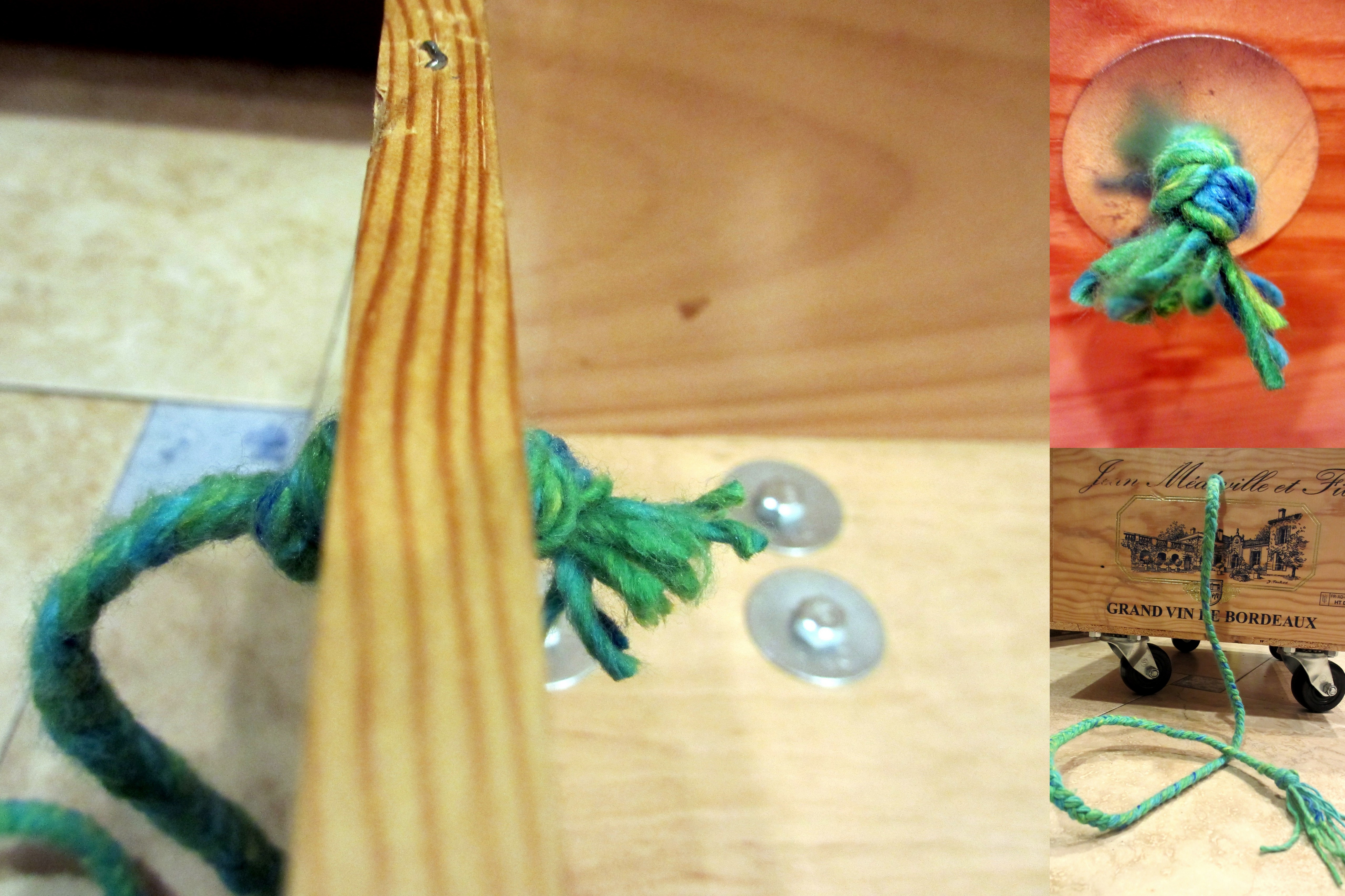 Drill a hole through the center of one of the narrow ends of the crate about 1″ down. String the last washer onto the the rope and tie a knot. Thread the rope through the hole you have just drilled such that the washer is on the inside of the crate. The washer is just a little extra insurance that as the wooden hole wears and becomes larger over time, the knot in the rope does not slip back through the hole. Tie another knot just on the outside of the crate so that the rope does not pull back into the crate. This will avoid friction that may weaken and break the rope. Tie a knot at the end of the rope farthest from the crate.