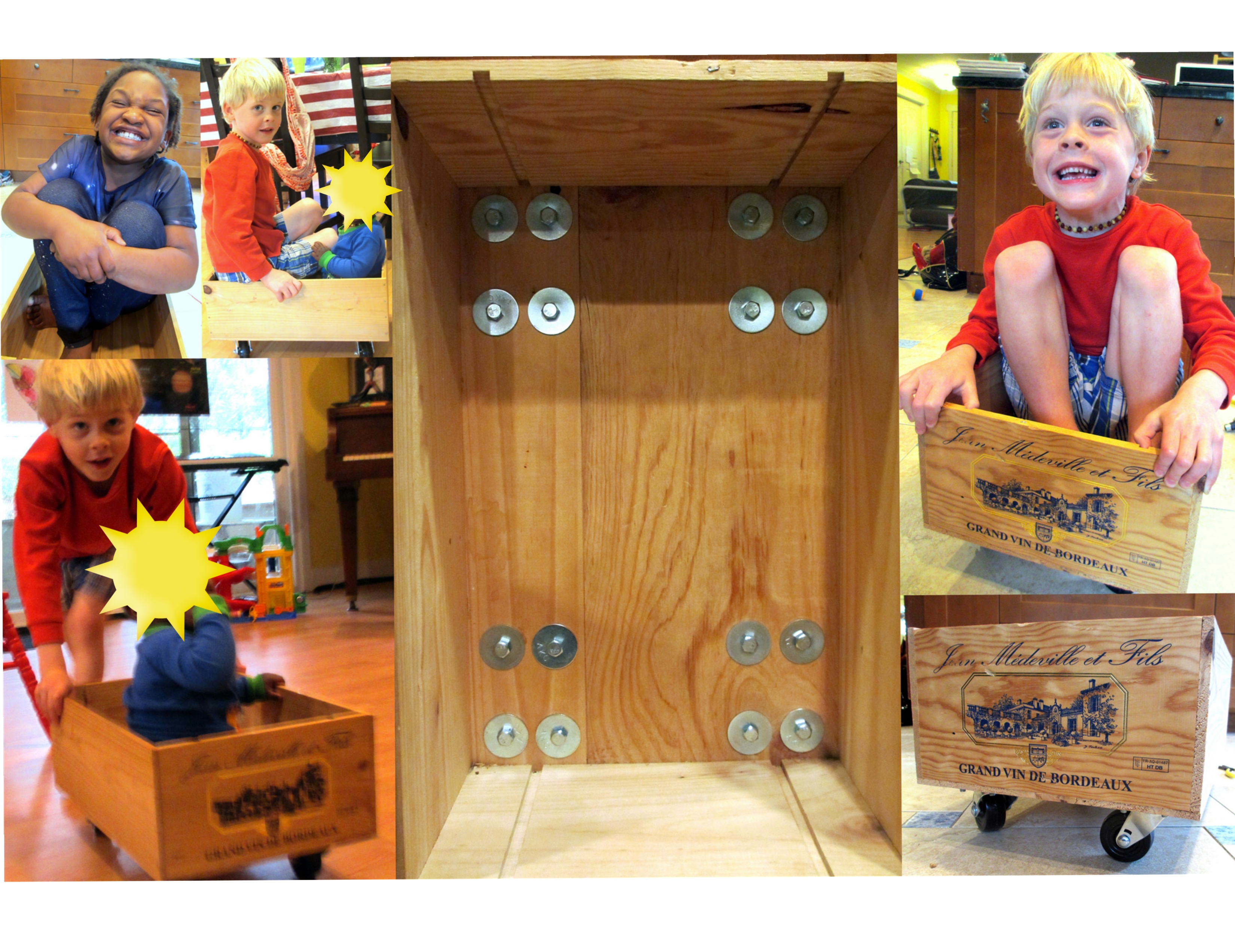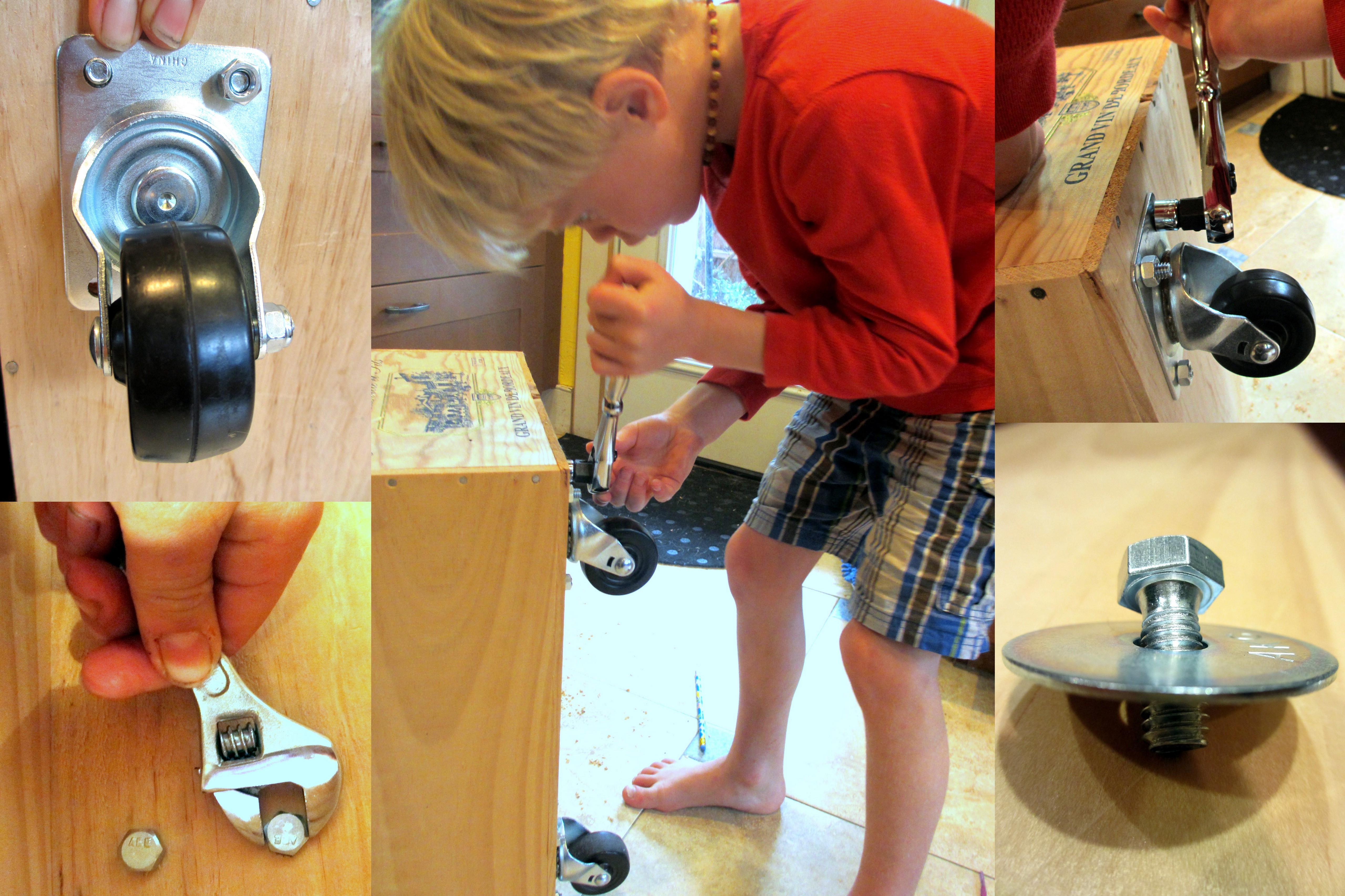 After your bolt holes have been drilled, turn your crate on it’s side and hold one wheel in place, bolt holes lined up with the ones you drilled into the bottom of the crate. Put a washer on each bolt and slide them, from the inside of the crate, into the bolt holes for one wheel. Place a washer on each bolt and finger tighten. The kids were able to do this step by themselves.