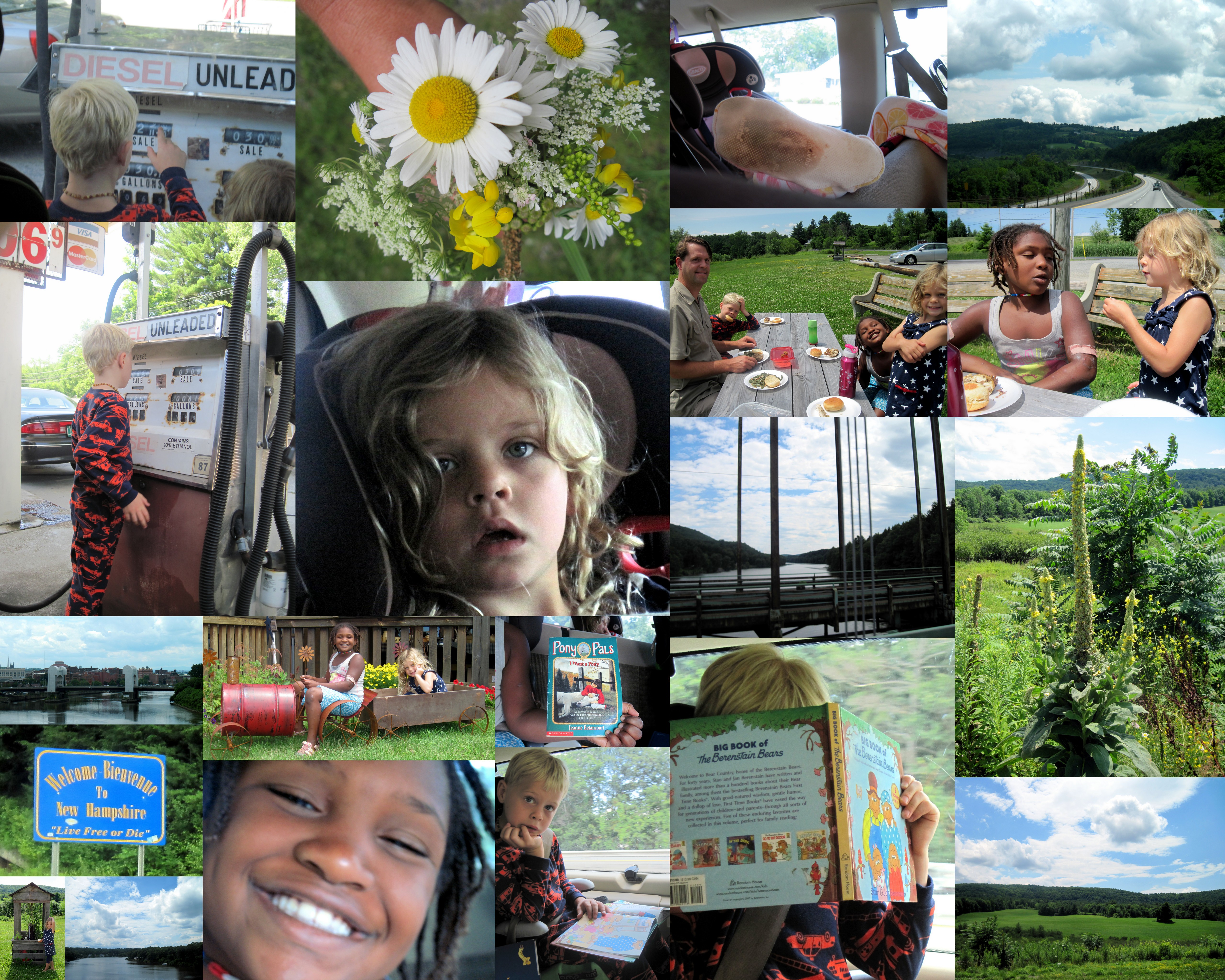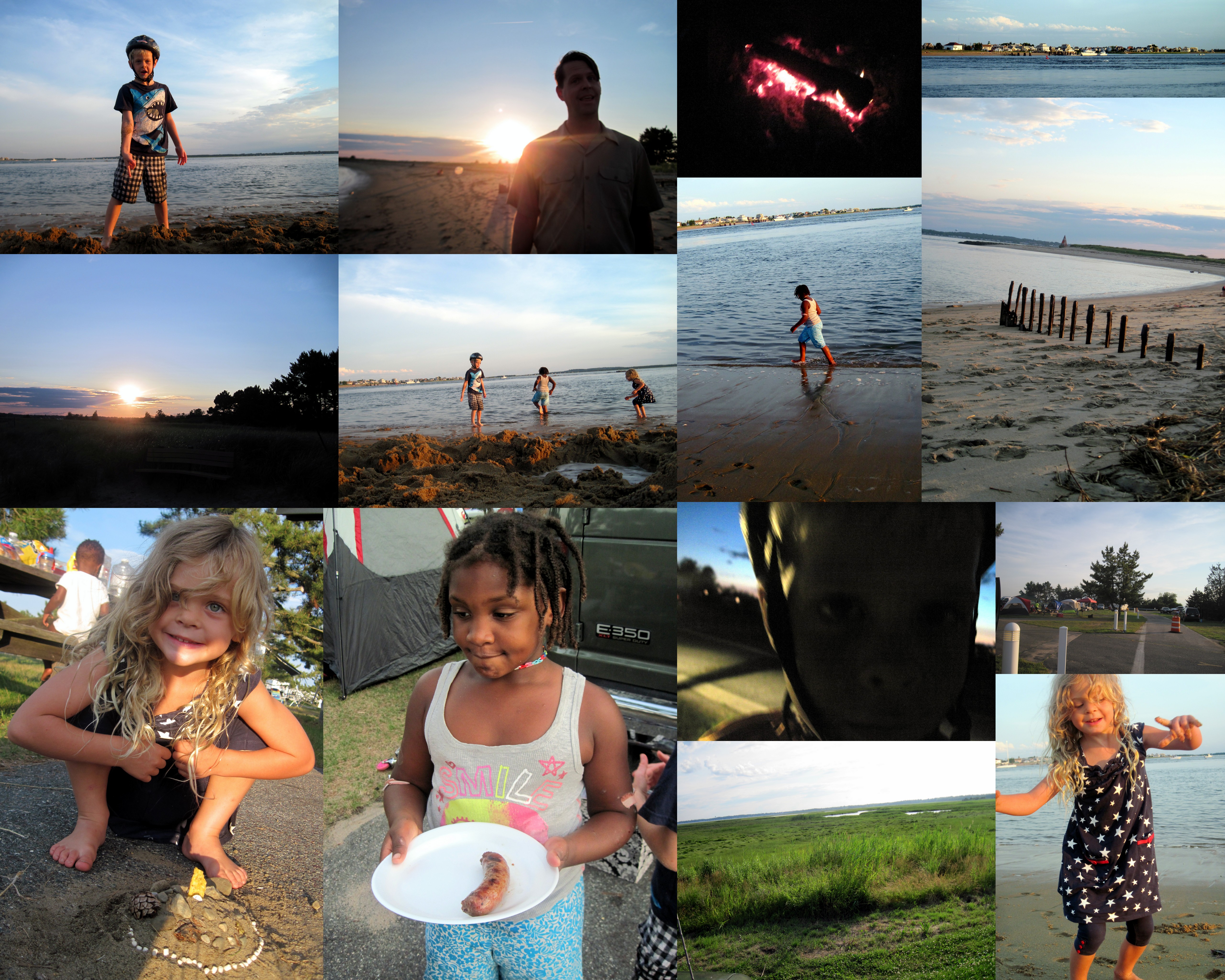 We found a camp site on the beach just south of the Maine border in New Hampshire. The beach was at a place where the river met the ocean, and the kids were able to play safely without worrying about large waves. The water was warm there, and the kids found little crabs crawling around on the shores, nibbling at their toes. Battered planks stock out into the water, showing that the shore was not always as peaceful as it now appears. We let the kids play and made sausage for dinner and then we went for a walk in the moonlight. As we walked we noticed odd lights in the sky heading out towards the sea. At first there was only one of them, but as we walked, we saw more and more until there were six or seven of them floating out over the water. We thought that they were probably some kind of floating paper balloon because over the water the flame went out, and each disappeared altogether. They were quite fun to watch, very different from anything we would be allowed to have in California. It is so wet here that even if one of the balloons fell to the ground, a fire would not start. We know from experience with difficulty starting campfires that wildfires are NOT a threat around here. It takes many matches and a lot of people to get the tiniest flame burning into a fire!
