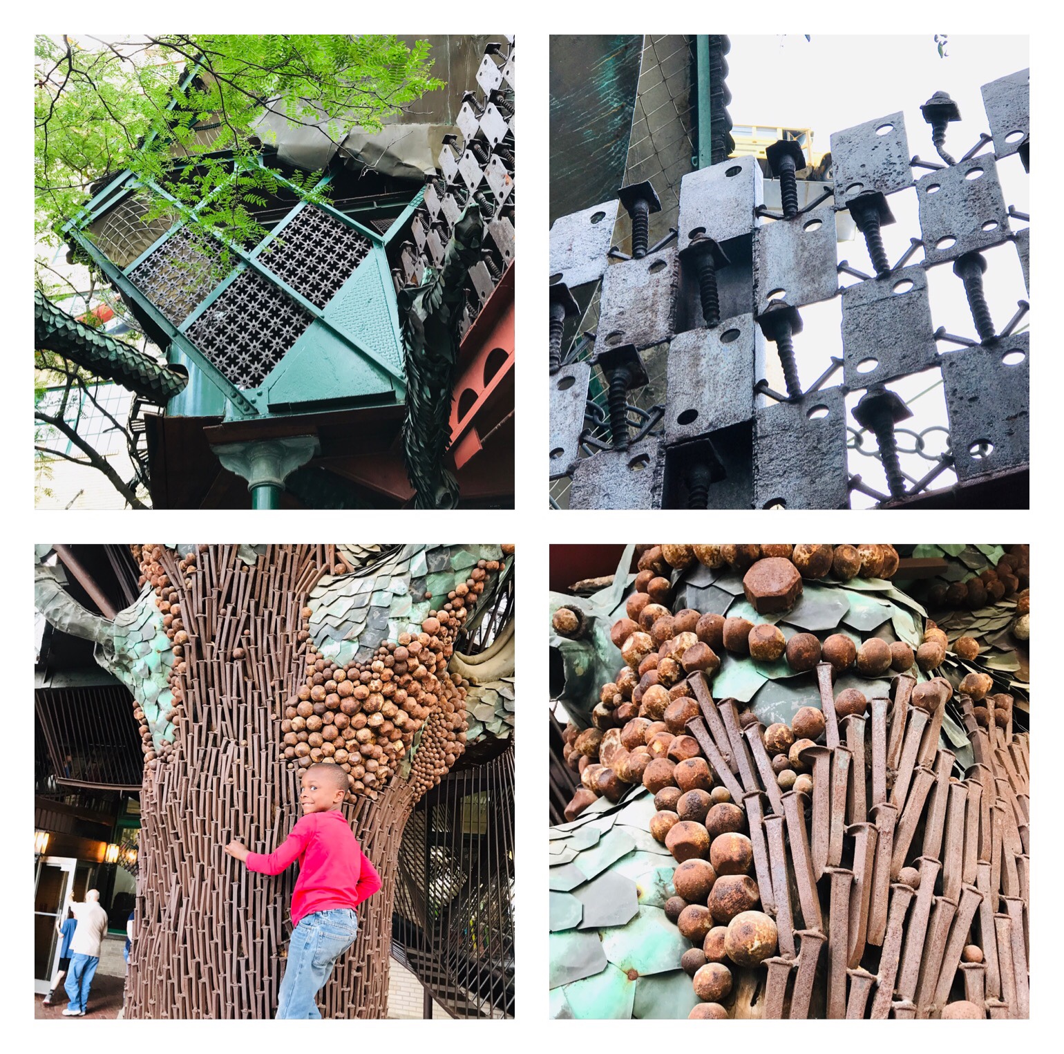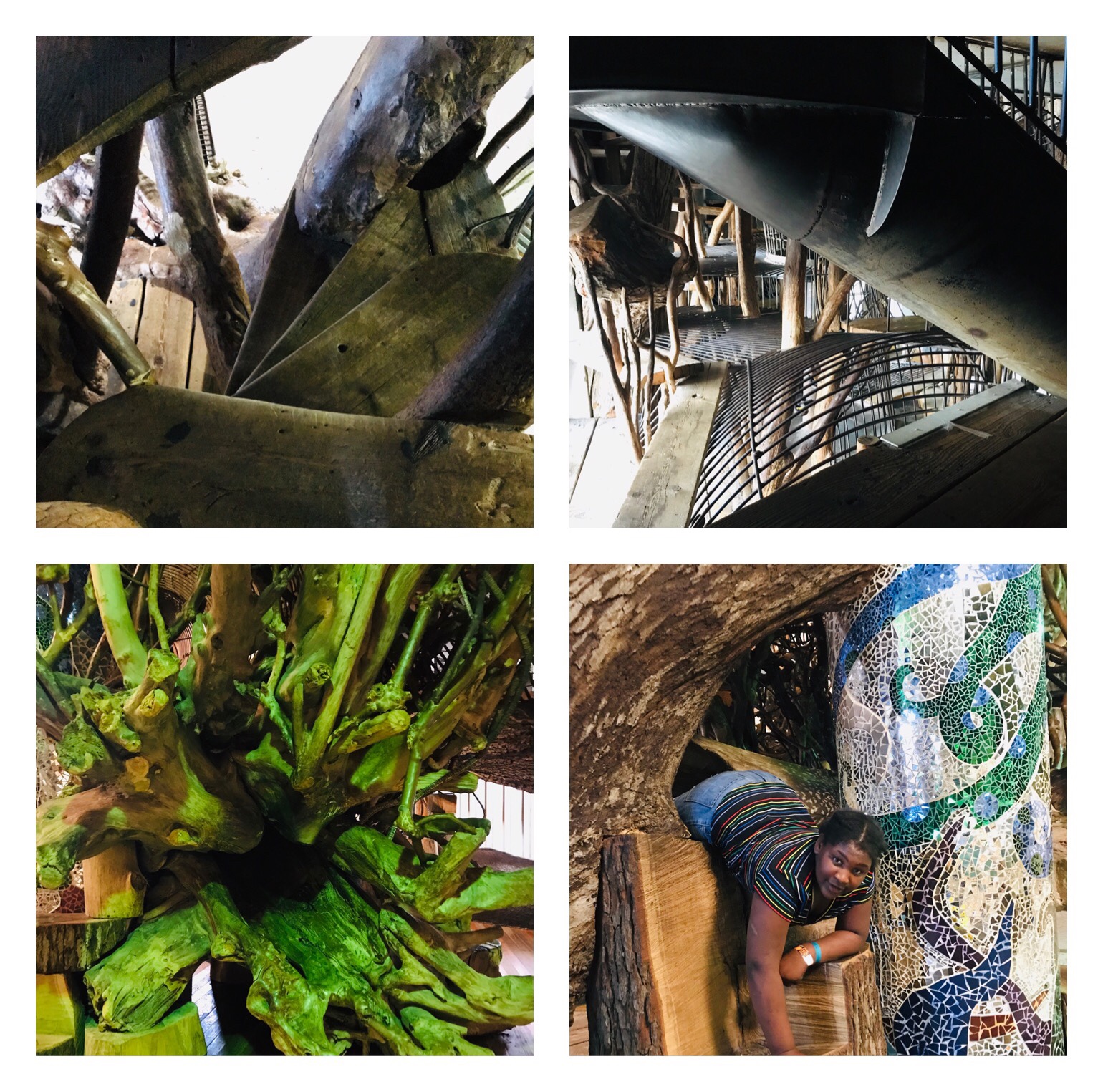 There is the false relief of coming out into the open, finally upright again, and the slight horror at the realization that you slid out of the roots of that tree on your belly. Mangled and cast-off metals from other demolished buildings grow into the spiraling tree tops you have escaped into. You climb every one if those soaring branches and slide down re-claimed culvert hollows to more welded tree houses. And, Nathan, you will be happy to know that all of the nieces and nephews survived, as did Miss Spare child.