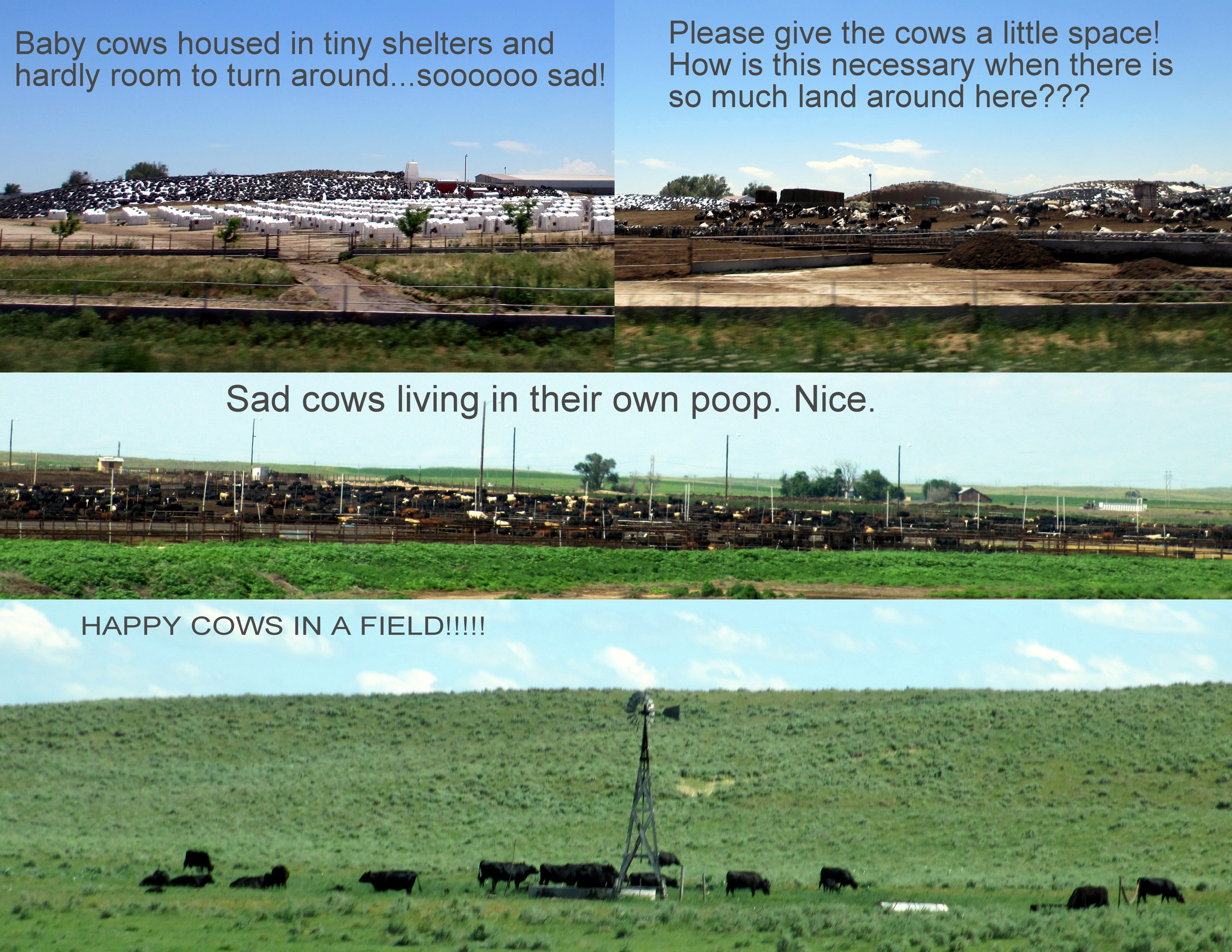 Eastern Colorado is home to feed lots and cattle, as well as a bit of grain. It did not take much to convince the kids that the feed lots were not places anything, even a cow, could be happy in (if happiness is an emotion a cow can feel, which is questionable), and at least such conditions were not we intended by God, one could argue, and so now, when my children see cows munching happily on green grass in wide places, baby cows by their mothers, they yell out, HAPPY COWS! When they see a feed lot or dairy where cows are crammed into a pooopie mess, a mess that smells so bad it turns the stomach of the driver in a closed vehicle, the babies living in little 6×6 cubes, crying for their mothers, they somberly discuss how unkind this is to the cow. It makes so much more sense to a child to see the torment of animals first-hand that to talk about it in the abstract from the kitchen table.Blog day 4153