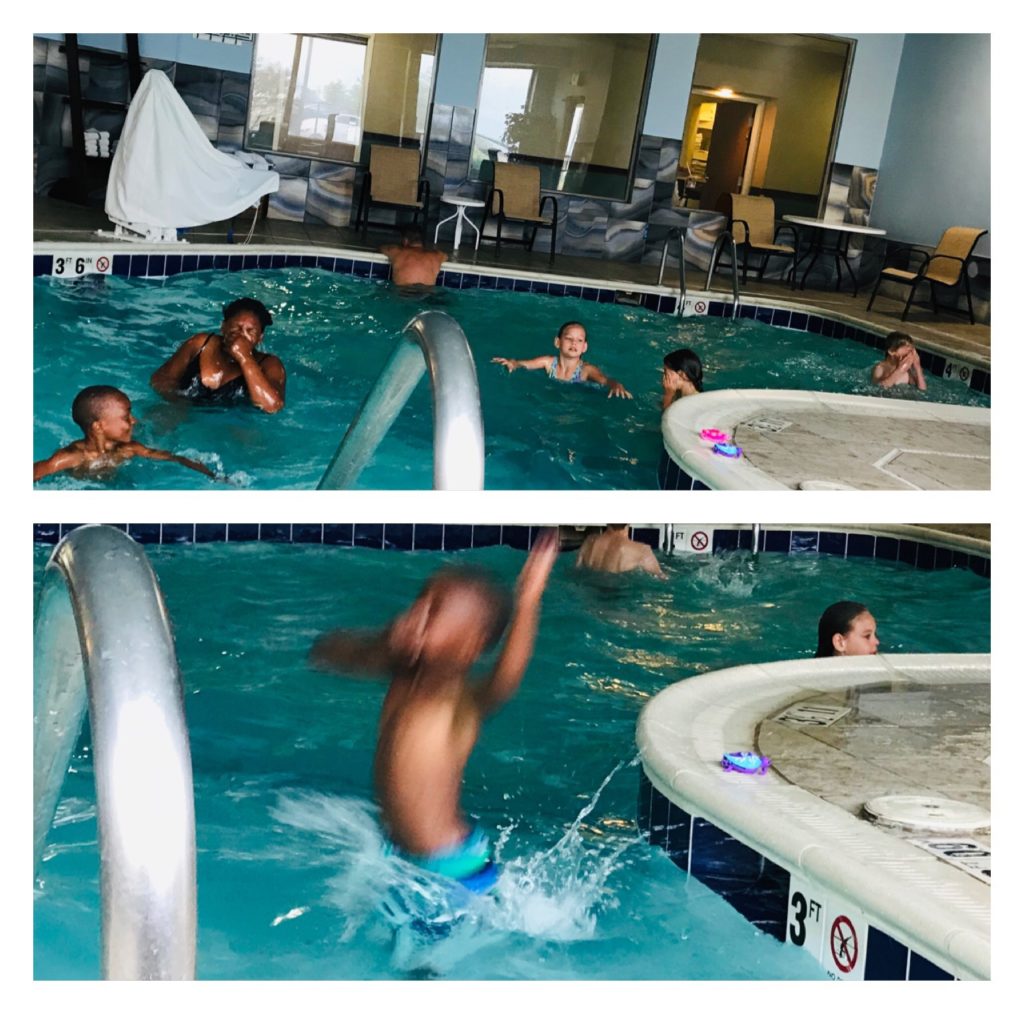 Pressing on. This morning Brandon reminded me of Jim Gaffigan saying of hotel pools, “Oh, yay! I get to swim and stay and pee all at the same time!” We stayed in our first hotel last night. We had to get two rooms because we are basically hauling a small village across the country, and somehow hotel people that kids sleeping on the floor is not civilized. I guess I agree. Hotel floors. Ew.
