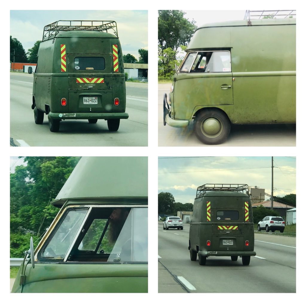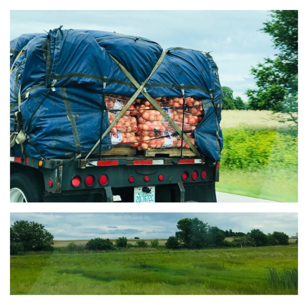 There are farms and hills and forests here. Sometimes there are farms on hills surrounded by forests, sometimes forests surrounding farmed hills, sometimes there are farms surrounded by forested hills. And red barns. And horses. Highways are narrow and uncrowded. You might pass an onion truck, or a truck filled with pigs, a truck carrying a monster tractor with menacing blades hanging off of it, and this hippy mobile. Hippy driver included.