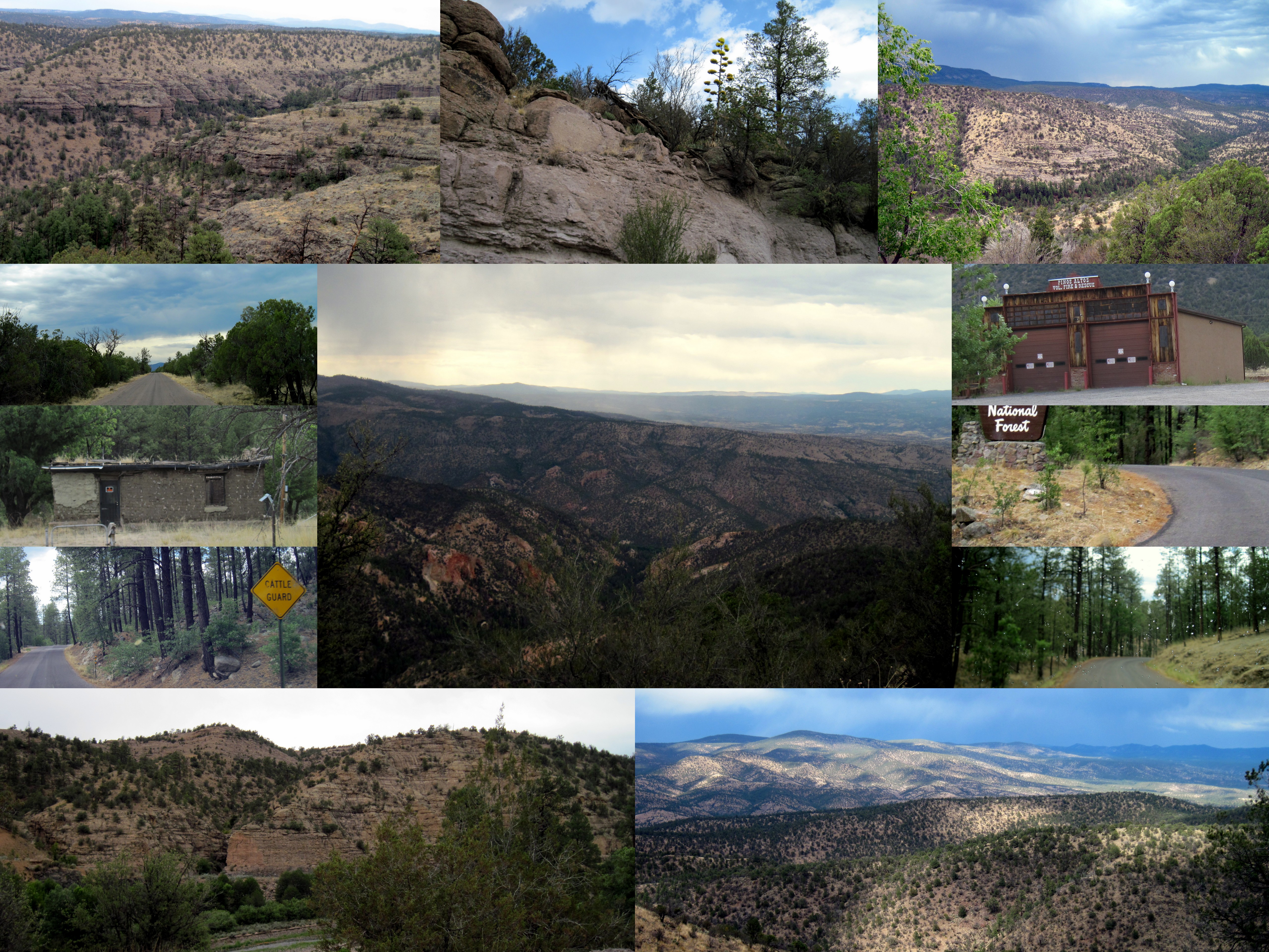 Our rout took us through such places as Silver City (Home of Memory Lane Cemetary and people who look like they could use some AC. But then the drive to Gila begins, and the heat dissipates, and it is only magical. The road twists on for 35 miles, but it curves so tightly, and the grade is simultaneously so steep that one must take it in 2nd gear, so it takes a good hour to get there. But on the way the views keep you occupied.